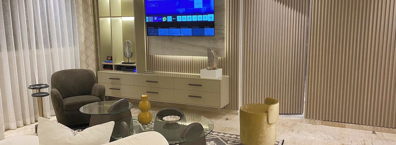 El reto en este apartamento en la ciudad fue la distribución de los muebles en el area central creando dos ambientes. Los dueños querían sentar a muchos invitados para sus reuniones familiares y circulo de oración. Así que tratamos que se sintiera un espacio de paz y tranquilidad manteniendo tonalidades neutras, con toques de color en los detalles y logrando un mejor funcionamiento del espacio.